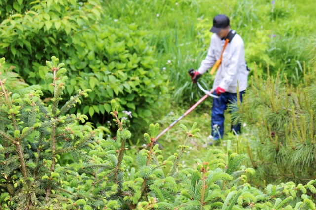 主に草刈り機を使用して刈りますが、石や砂利が多くて草刈り機が使用できない場合は手作業で鎌を使用して刈り取るか根から引き抜きます。